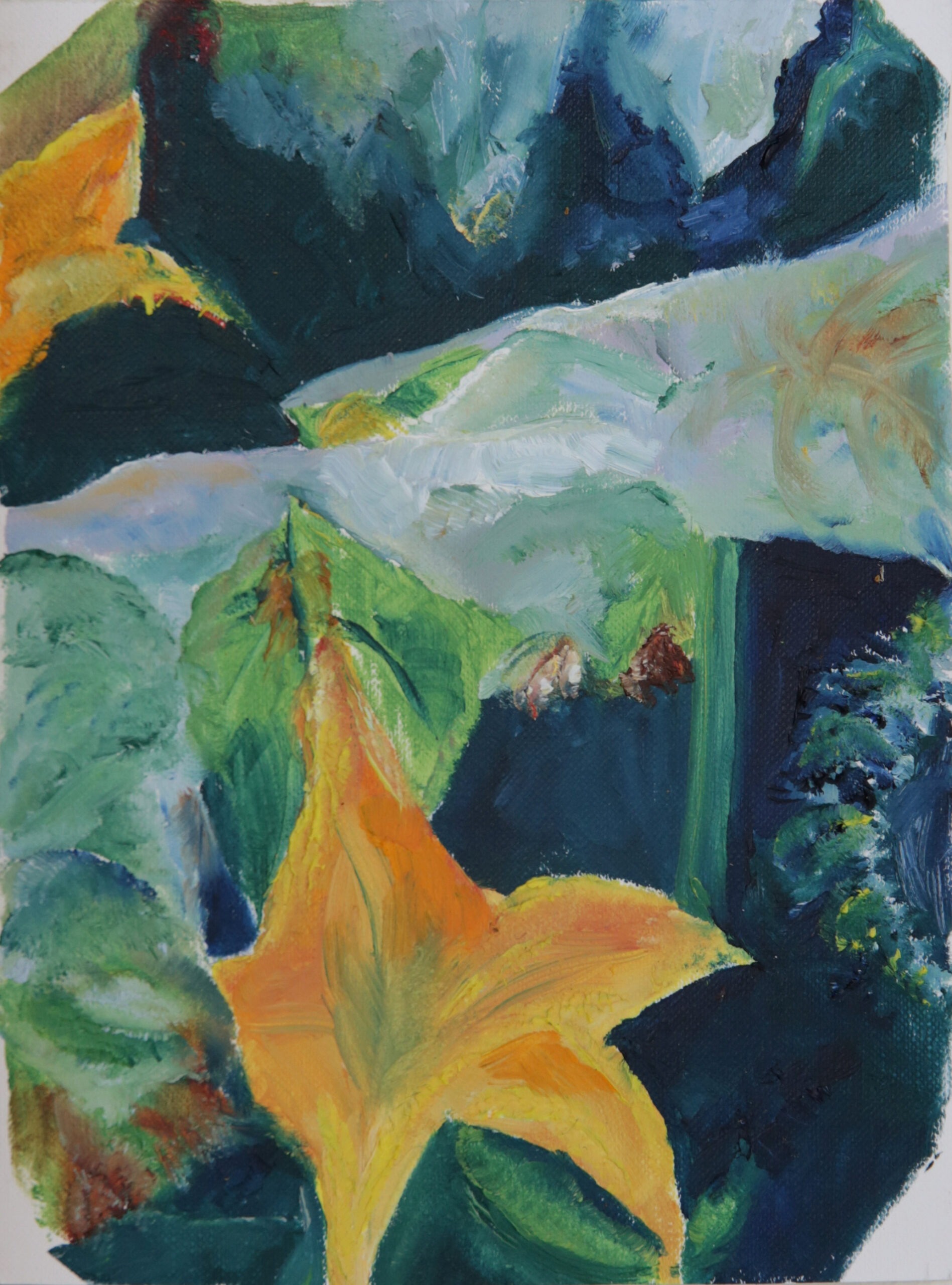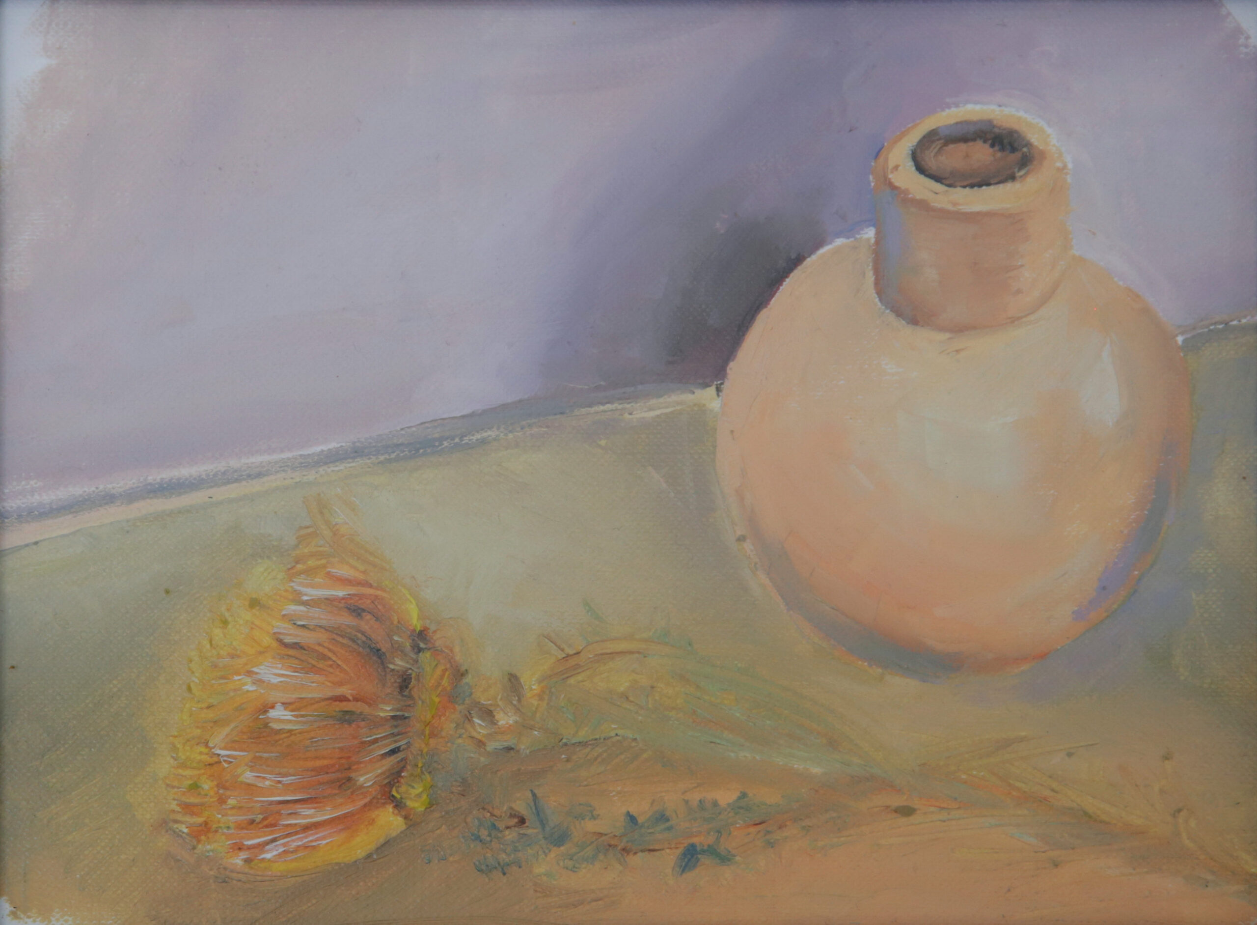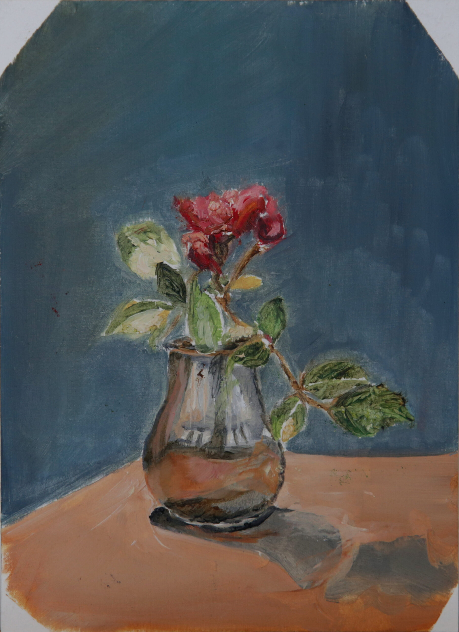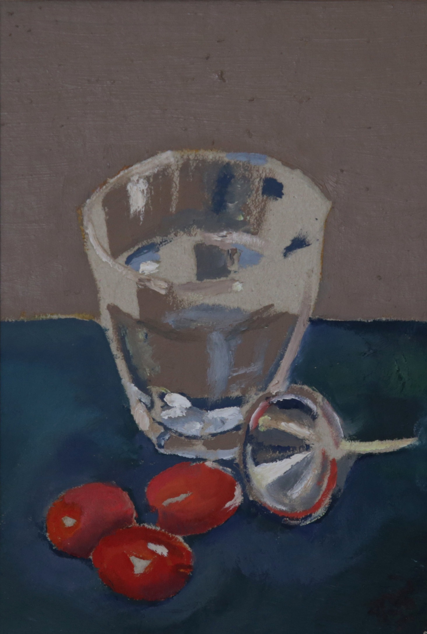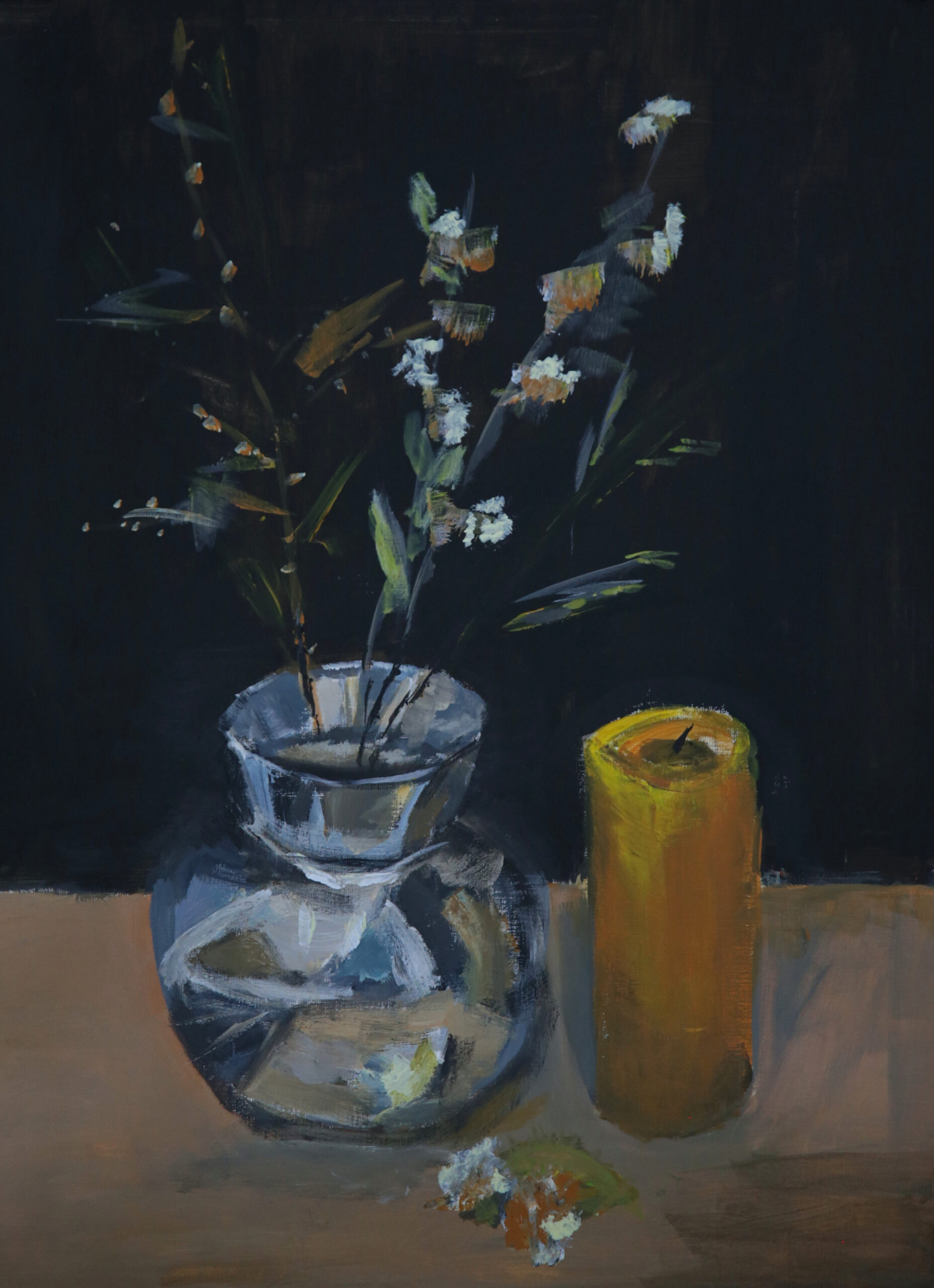 olieflesjes, olie op doek, 80 x 100cm, 125,–Essaouira, Marokko, acryl op papier, 34 x 40 cm, 65,–Vaas met kaars, acryl op paier, 50 x 60 cm, 65,–stilleven met mandarijn, olie op papier, 14,7 x 20 cm, 15,–stilleven met auberginebloem, olie op papier, 14,7 x 20cm, 15,–roos op vaasje, olie op papier, 14,7 x 20cm, 15,–wandelschoenen, olie op paneel, 21,7 x 19,3cm, 40,–vaasje met droogbloem, ingelijst (zwarte lijst) met passe-partout (creme wit), 22 x 17,3cm, 30,–glas met tomaatjes, olie op karton, 17x 23,7cm, 15,–citroen en limoen, acryl op papier, 20 x 14,7cm, 5,–